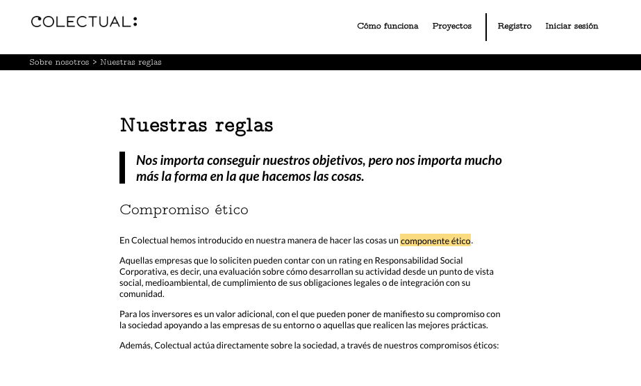 Se jactan de ser una plataforma con un enofque ético, aunque hay cosas que a mi no me lo parecen como industria de maltrato animal, yo, por ahí, no pasaré. Pero hay otros proyectos que sí tienen buena pinta. Su lema es «rentabilidad + resposabilidad». He de decir que su FAQ es interesante y me ha camelado, dicen exactamente lo que yo quiero escuchar.